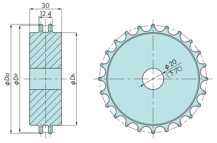 | 형번 | 잇수 | 피치 원 직경 Dp mm | 외경 Do mm | 축 구멍 모양 |