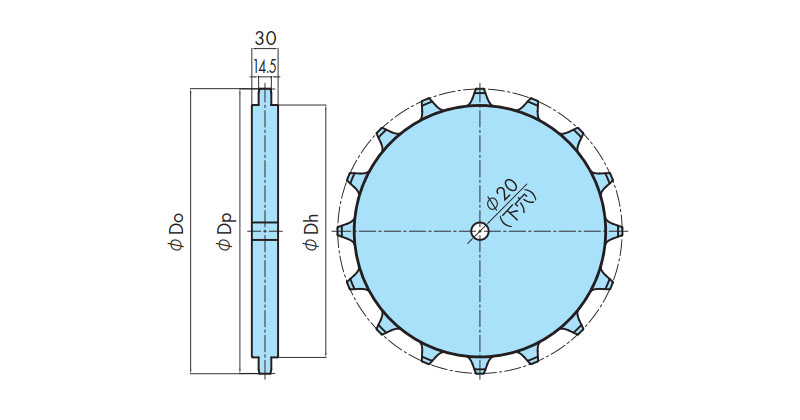 | 형번 | 잇수 | 피치 원 직경 Dp mm | 외경 Do mm | 축 구멍 모양 |