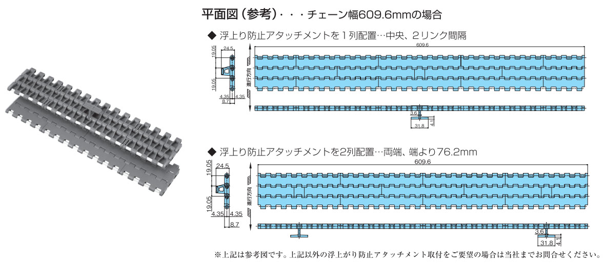 • ・戻り側で浮上がり防止アタッチメント(タブ)を吊下げることでプレート上面のキズ付きを防止