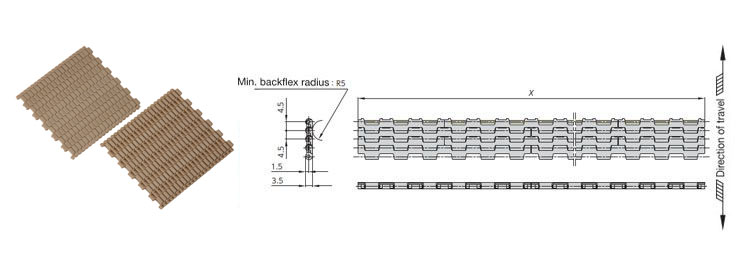 • ・耐熱性 (MAX150℃) 、耐薬品性、摺動性に優れた結晶性樹脂であるPEEK樹脂製のプラスチックモジュラーチェーン