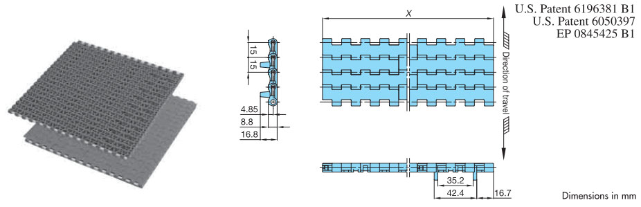 • ・幅広と幅狭のプラスチック製モジュールをレンガ状に組合せ、ワイドな搬送面を実現し大量搬送が可能です。