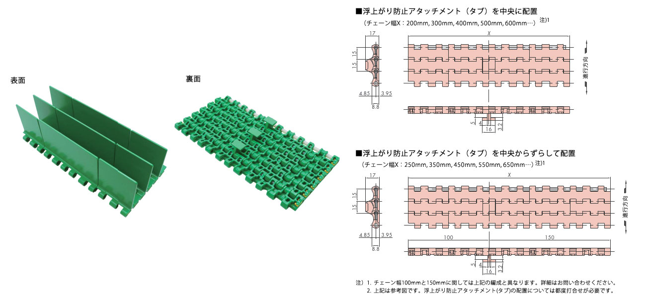 プラスチックモジュラーチェーンWT1515T-F-W形 主要諸元