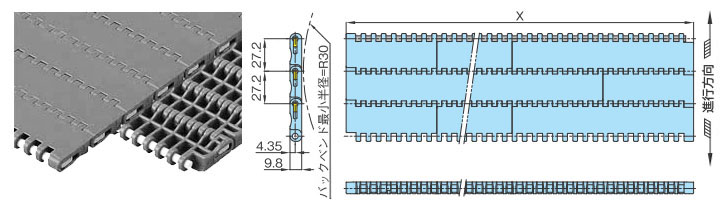 • ・幅広と幅狭のプラスチック製モジュールをレンガ状に組合せ、ワイドな搬送面を実現し大量搬送が可能です。