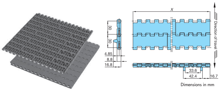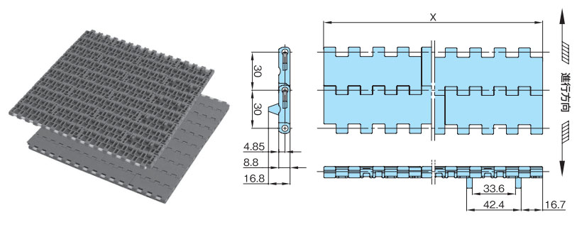 • ・폭넓고 폭이 좁은 플라스틱제 모듈을 벽돌 형태로 조합해 와이드한 반송면을 실현해 대량 반송이 가능합니다.