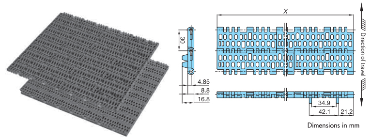 • ・폭넓고 폭이 좁은 플라스틱제 모듈을 벽돌 형태로 조합해 와이드한 반송면을 실현해 대량 반송이 가능합니다.