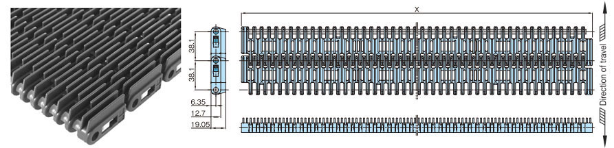 • ・幅広と幅狭のプラスチック製モジュールをレンガ状に組合せ、ワイドな搬送面を実現し大量搬送が可能です。