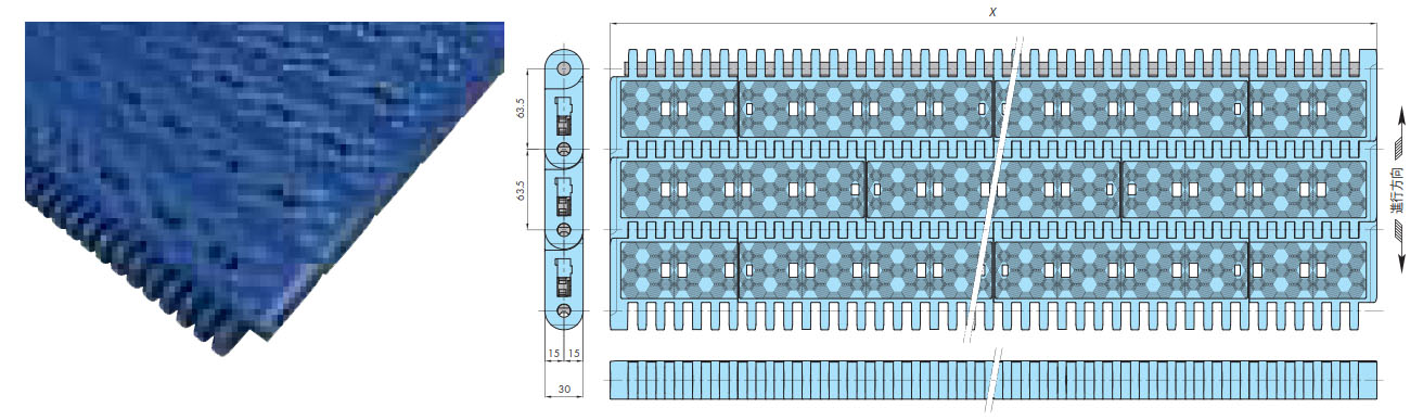 • ・チェーン上面の特殊な凹凸により、滑り止め効果を発揮します。チェーン上面での作業でもすべりにくく、引掛りにくい形状です。マンコンベヤなどにも適します。