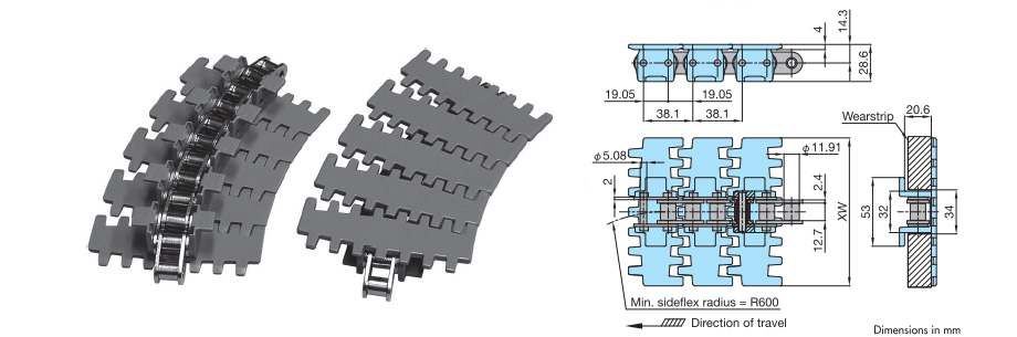 • ・곡선용 롤러 체인에 톱 플레이트를 스냅 온한 타입으로, 톱 플레이트만 교체도 가능.