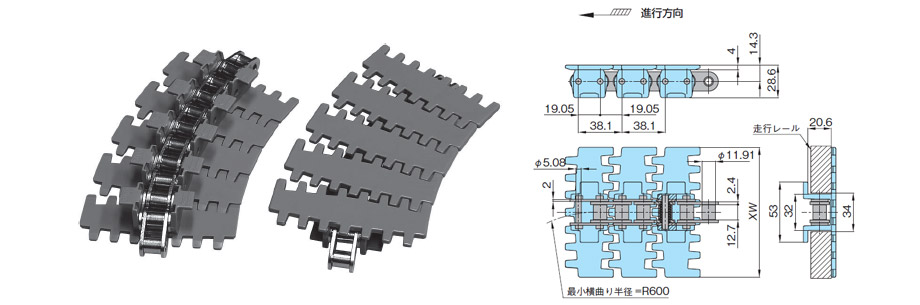 • ・곡선용 롤러 체인에 톱 플레이트를 스냅 온한 타입으로, 톱 플레이트만 교체도 가능.