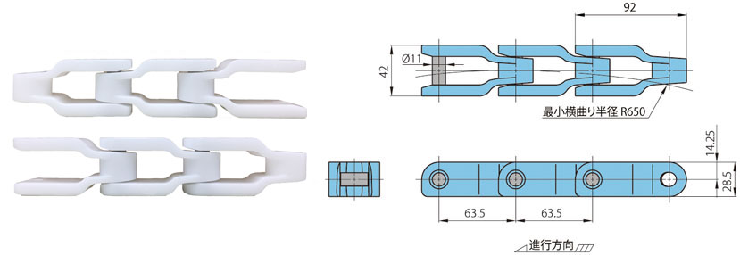 • ・오프셋 형상을 한 심플한 플라스틱 체인으로, 케이스의 반송 등에 사용되고 있습니다.