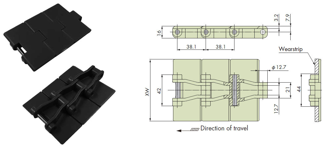 • ・プレート厚み3.2mmを採用。ステンレストップチェーン(TT形)と同じプレート厚みです。
