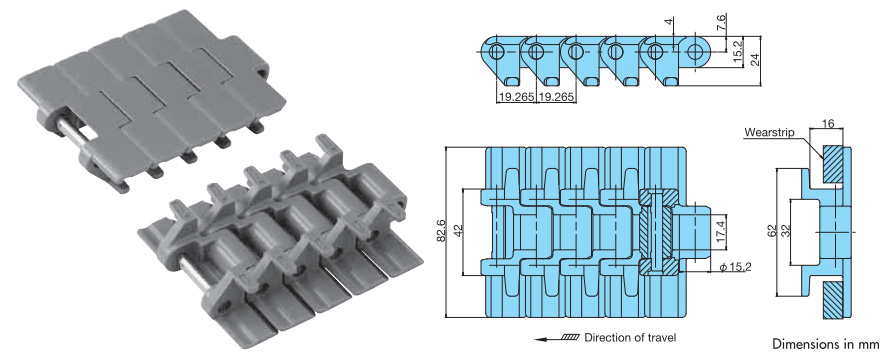 • ・부상 방지 어태치먼트 부착 체인. 코너부나 상승, 하강 컨베이어에서의 부상이나 리턴측에서의 플레이트 상면의 상처를 방지합니다.