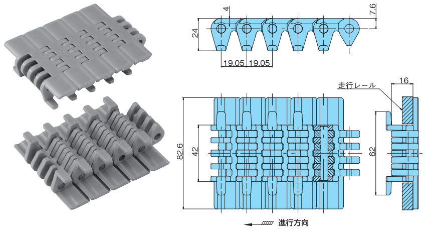 • ・特殊スプロケットを採用。スプロケットとの噛合い時の多角形運動を抑え、安定搬送が可能です。