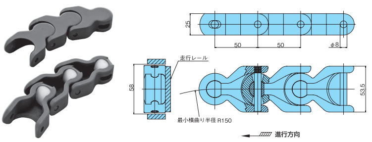 • ・横曲り半径(R=150)が小さくコンパクトなレイアウトが可能です。