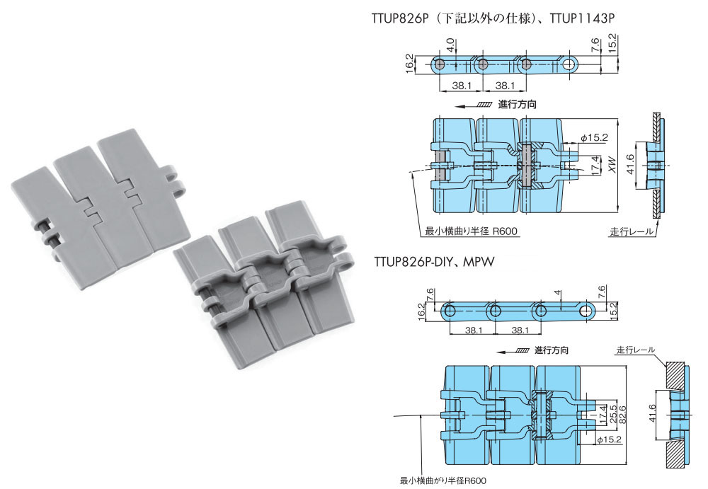 • ・曲線搬送用プラトップチェーンの標準タイプ。簡単構造で洗浄も容易です。