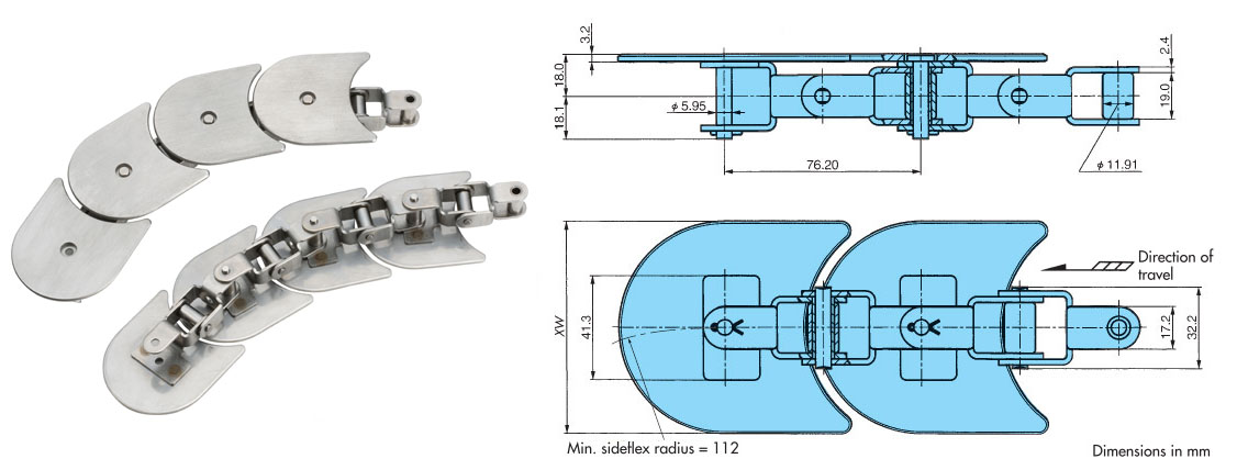 - ・수직 방향으로도 굴곡도 가능한 수평 반송용 체인. 다양한 레이아웃으로 사용할 수 있습니다. (3 차원 레이아웃도 가능)