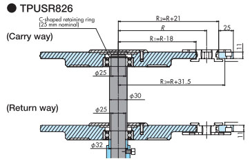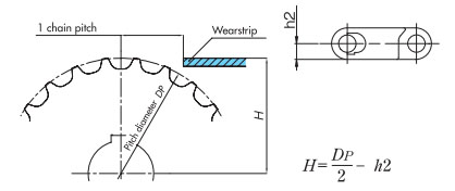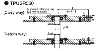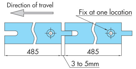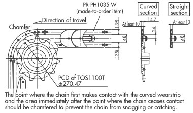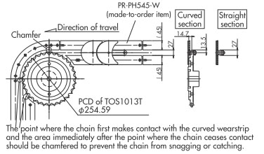 스프로킷과 레일 단부까지의 거리 C는 기본 체인 1 피치 분 설치하십시오. 또한, 종동측 레일 단부는 체인과 레일의 걸림을 방지하기 위해 R 굽힘, 혹은 모따기를 실시해 주십시오.