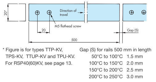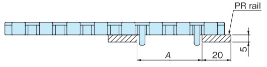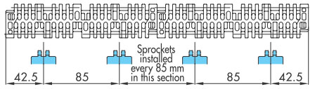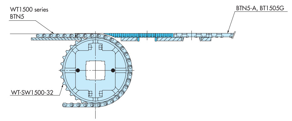 레일은 스프로킷과 교대로 등 간격으로 배치하십시오. 레일 간격 A는 BTN이 76mm, BT6, BT8, WT1500, WT3005, BTC8S가 76.2mm, WT2500이 76.2mm(레일 폭 25mm), WT3086, WT2250이 85mm, WT3816이 100mm(레일)