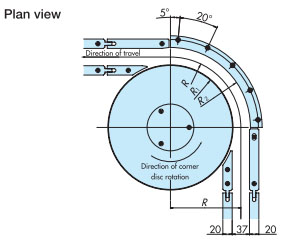 당사 노즈바나 GTO/TOD 타입 체인을 사용함으로써, 통상 필요로 하는 데드 플레이트를 사용하지 않고 반송물의 부드러운 90° 변환 반송을 가능하게 하고 있습니다.